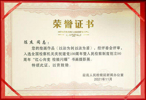 为庆祝中国共产党成立100周年暨人民检察制度创立90周年,最高人民检察院新闻办公室联合福建省检察院共同主办“红心向党,检徽闪耀”书画摄影展,今年5月15日至7月20日,面向全国检察机关全体检察人员征集书法、绘画、摄影作品。陈杰获悉这一信息后,潜心绘制了漫画作品《以法为剑 以法为盾》,发送给了组委会。经评委会评审,顺利入选书画摄影展。