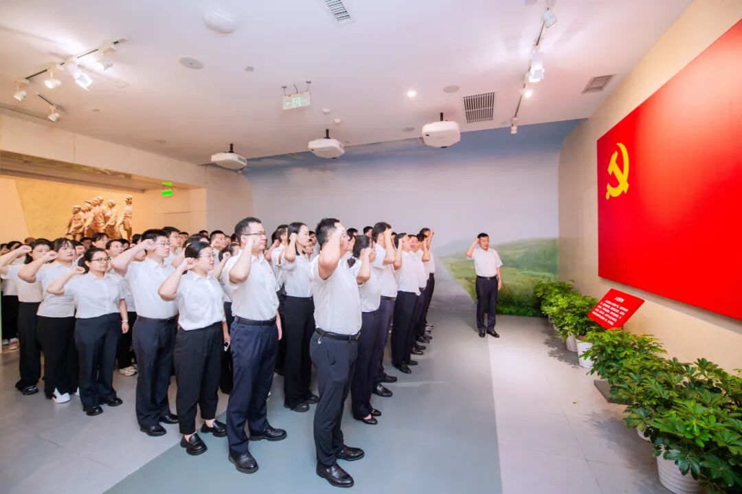 在展馆东侧,面对鲜红的党旗,检察干警们庄严肃立,高举右拳,重温入党誓词。铿锵有力的誓言在展厅内回荡,彰显着不忘初心、牢记使命的坚定决心。