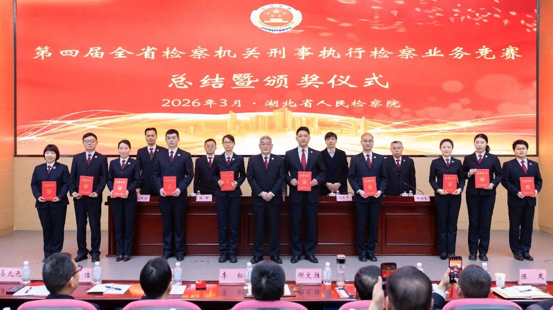 图为湖北省检察院政治部副主任刘文孝为获得“全省刑事执行检察业务能手”称号的参赛选手颁奖。