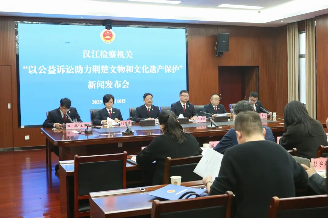 近日,湖北省人民检察院汉江分院召开汉江检察机关“以公益诉讼助力荆楚文物和文化遗产保护”新闻发布会。部分省人大代表、人民监督员、“益心为公”志愿者代表和省级新闻媒体记者受邀参加活动。
