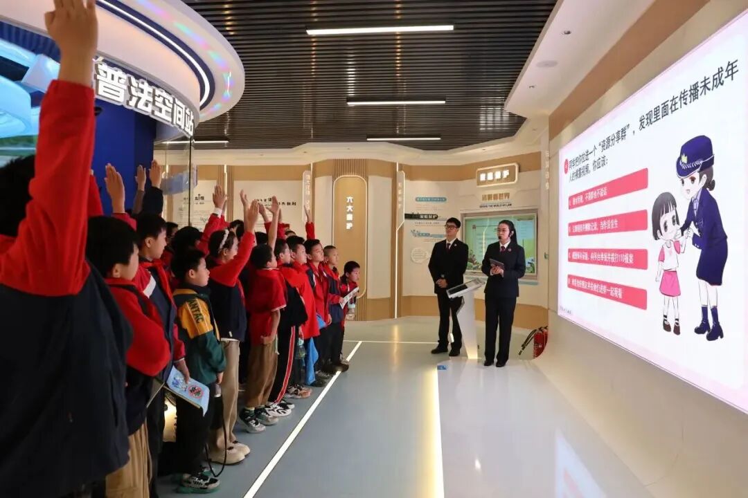 2025年9月,襄阳高新技术产业开发区检察院干警在未成年人保护实践基地给前来参观的小学生们上“网络安全教育”法治课。