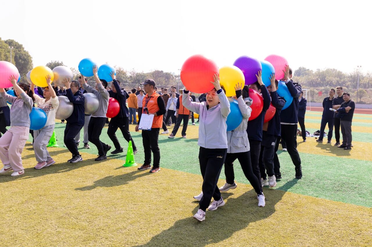 众志成城齐向前,携手并肩共争先。陆地龙舟和夹瑜伽球接力项目吸引了所有人的目光,“一二一,左右左!”大家响着整齐的口号往前冲。